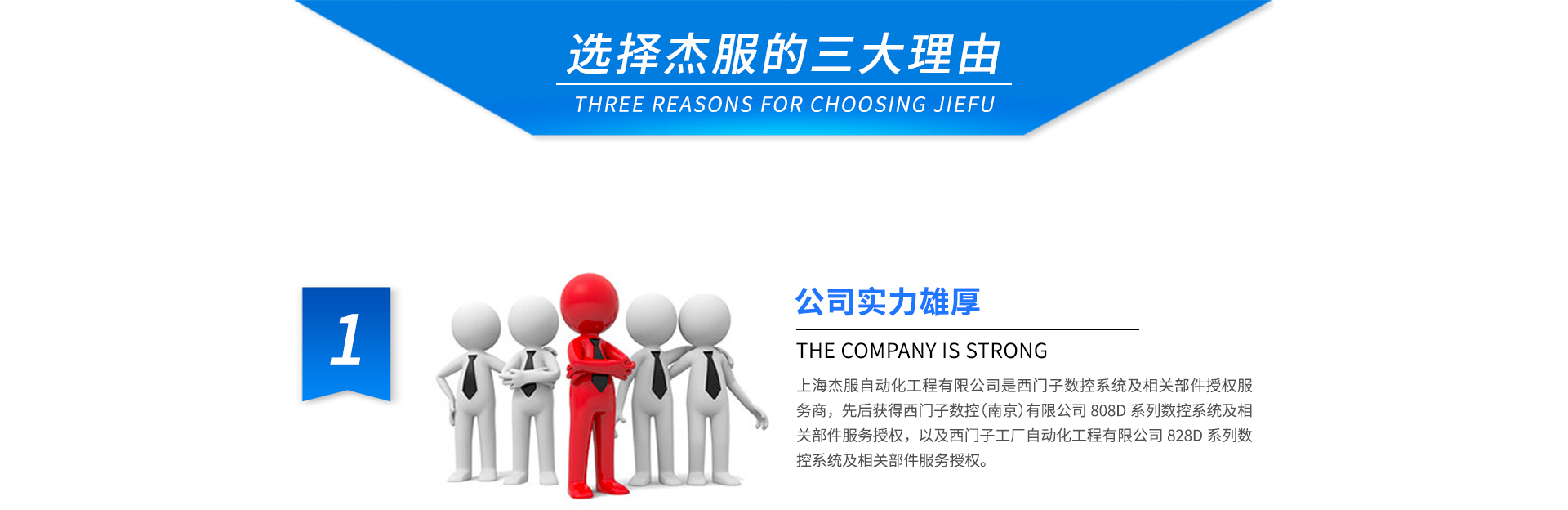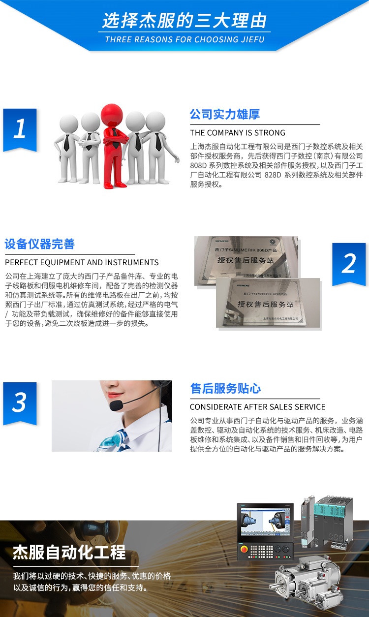 - 上海杰服自动化工程有限公司是西门子数控系统及相关部件授权服务商,先后获得西门子数控(南京)有限公司808D系列数控系统及相关部件服务授权,以及西门子工厂自动化工程有限公司828D系列数控系统及相关部件服务授权。公司专业从事西门子自动化与驱动产品的服务,业务涵盖数控、驱动及自动化系统的技术服务、机床改造、电路板维修和系统集成、以及备件销售和旧件回收等,为用户提供全方位的自动化与驱动产品的服务解决方案。